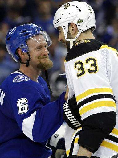 Tampa Bay Lightning defenseman Anton Stralman (6) pats Boston Bruins defenseman Zdeno Chara (33) after Game 5 of an NHL second-round hockey playoff series Sunday, May 6, 2018, in Tampa, Fla. (AP Photo/Chris O'Meara) The Associated Press