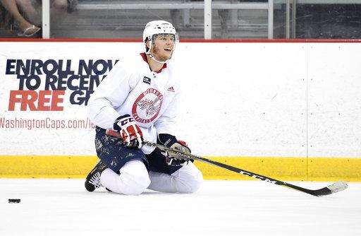 Washington Capitals left wing Andre Burakovsky kneels on the ice at an NHL hockey practice, Thursday, May 10, 2018, in Arlington, Va. (AP Photo/Nick Wass) The Associated Press