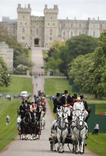 Horse-drawn carriages make their way down the Long Walk from Windsor Castle in Windsor, England, Friday, May 11, 2018. All roads seem to lead to Windsor Castle, a magnificent fortress perched high on a hill topped by the royal standard when the queen is in residence. It is here - a favoured royal playground since William the Conqueror built the first structure here in 1070 - that the royal wedding of Prince Harry and Meghan Markle will take place. (AP Photo/Alastair Grant) The Associated Press