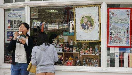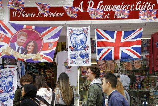 Tourists stand near a shop selling royal memorabilia near Windsor Castle in Windsor, England, Friday, May 11, 2018. All roads seem to lead to Windsor Castle, a magnificent fortress perched high on a hill topped by the royal standard when the queen is in residence. It is here - a favoured royal playground since William the Conqueror built the first structure here in 1070 - that the royal wedding of Prince Harry and Meghan Markle will take place. (AP Photo/Alastair Grant) The Associated Press