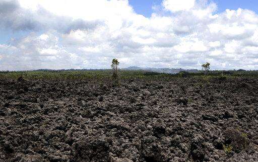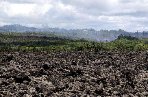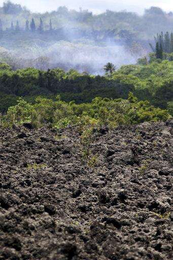 Volcanic gases and ash rise from recent lava fissures near Pahoa, Hawaii on Monday, May 14, 2018. The field of hardened lava rocks in the foreground is from previous eruptions. People nixing vacations to Hawaii's Big island has cost the tourism industry millions of dollars as the top attraction, Kilauea volcano, keeps spewing lava. (AP Photo/Caleb Jones) The Associated Press