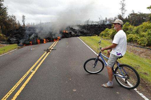 File - In this May 5, 2018, file photo, Leilani Estates resident Sam Knox watches the lava stretch across the road in Pahoa, Hawaii. Hawaii’s Kilauea volcano has spewed lava into the air, destroyed homes, forced residents into shelters, and agitated an otherwise cheerful, small community where everyone is a neighbor. (AP Photo/Marco Garcia, File) The Associated Press