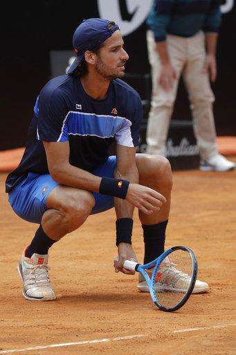 Spain's Feliciano Lopez squats on the court during his match against Japan's Kei Nishikori at the Italian Open tennis tournament, in Rome, Monday, May, 14, 2018. (AP Photo/Alessandra Tarantino) The Associated Press