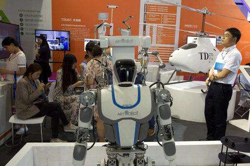 Visitors to the 21st China Beijing International High-tech Expo look at robots and helicopter drone displayed in Beijing, China, Thursday, May 17, 2018. The Trump administration has threatened to impose tariffs on up to $150 billion in Chinese imports to punish Beijing over trade practices requiring American companies to hand over technology in exchange for access to the Chinese market. China has counterpunched by targeting $50 billion in U.S. products.(AP Photo/Ng Han Guan) The Associated Press