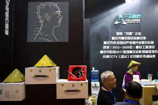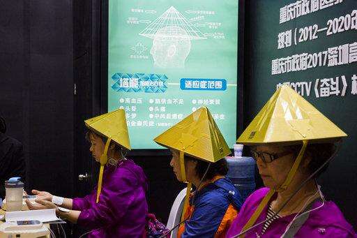 Chinese women try out a pyramid-shaped device purported to improve blood circulation in the brain during the 21st China Beijing International High-tech Expo in Beijing, China, Thursday, May 17, 2018. The annual exhibition is a showcase of China's state-of-the-art technologies and cutting-edge ideas. (AP Photo/Ng Han Guan) The Associated Press