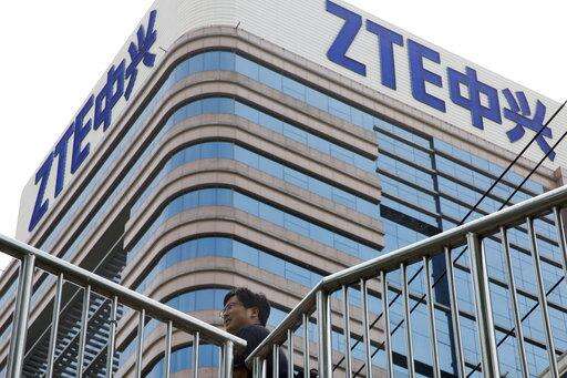 In this photo taken May 8, 2018, a man walks past a building with the ZTE logos in Beijing. As Chinese officials prepare to hold talks with their counterpart in Washington the two countries are reportedly attempting a swap: Relief for ZTE in return for Beijing dropping plans to impose tariffs on U.S. farm products.(AP Photo/Ng Han Guan) The Associated Press
