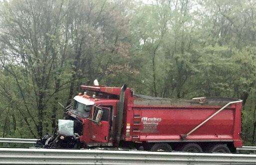 The front end of the red dump truck was mangled in the wreck, which took place about 50 miles (80 kilometers) west of New York. The truck was registered to Mendez Trucking, of Belleville, and had "In God We Trust" emblazoned on the back of it.
