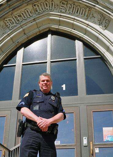 In this undated photo provided by City of Dixon, police officer Mark Dallas poses for a photo in front of Dixon High School in Dixon, Ill. Dallas, a school resource officer at the northern Illinois high school, was hailed as a hero Wednesday, May 16, 2018, for shooting and arresting a former student who fired on him in a hallway while staff and seniors were meeting for a graduation rehearsal. (City of Dixon via AP)