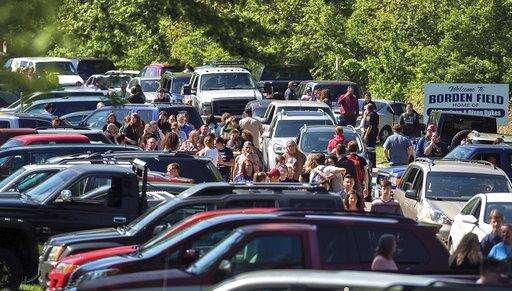 Parents wait down the road to meet their children following a shooting at Dixon High School Wednesday, May 16, 2018, in Dixon, Ill. A 19-year-old who showed up at his former high school in northern Illinois and opened fire on a police officer working there, was shot by the officer and taken into custody. The officer, who was not injured, was hailed a hero for his quick response protecting students and staff who had gathered at Dixon High School for a graduation rehearsal. (Alex T. Paschal/Sauk Valley Media via AP)