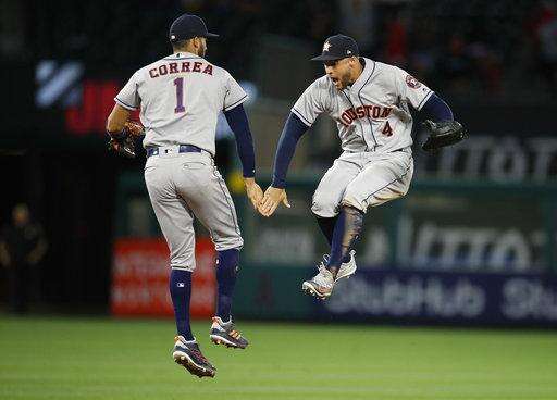 Houston Astros' Carlos Correa, left, and George Springer celebrate the team's 2-0 win over the Los Angeles Angels in a baseball game Wednesday, May 16, 2018, in Anaheim, Calif. (AP Photo/Jae C. Hong) The Associated Press