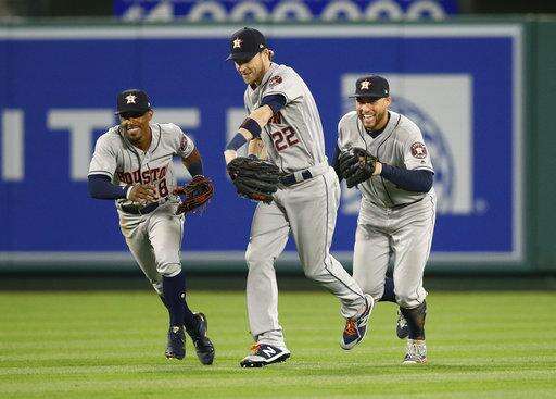 Houston Astros' Tony Kemp, Josh Reddick and George Springer, from left, celebrate the team's 2-0 win over the Los Angeles Angels in a baseball game Wednesday, May 16, 2018, in Anaheim, Calif. (AP Photo/Jae C. Hong) The Associated Press