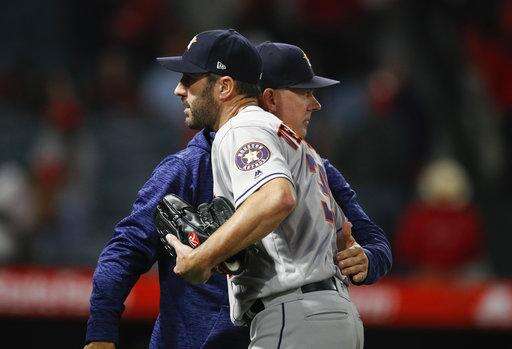 Houston Astros starting pitcher Justin Verlander gets a pack on the back from manager AJ Hinch after the team's 2-0 win over the Los Angeles Angels in a baseball game Wednesday, May 16, 2018, in Anaheim, Calif. (AP Photo/Jae C. Hong) The Associated Press
