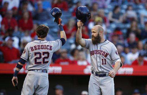 Houston Astros' Evan Gattis, right, celebrates his two-run home run with Josh Reddick during the second inning of the team's baseball game against the Los Angeles Angels on Wednesday, May 16, 2018, in Anaheim, Calif. (AP Photo/Jae C. Hong) The Associated Press