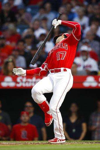 Los Angeles Angels' Shohei Ohtani, of Japan, loses balance after swinging at a pitch during the fourth inning of the team's baseball game against the Houston Astros on Wednesday, May 16, 2018, in Anaheim, Calif. (AP Photo/Jae C. Hong) The Associated Press