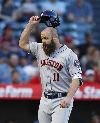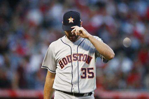 Houston Astros starting pitcher Justin Verlander adjusts his hat as he walks toward the dugout after the third inning of the team's baseball game against the Los Angeles Angels on Wednesday, May 16, 2018, in Anaheim, Calif. (AP Photo/Jae C. Hong) The Associated Press