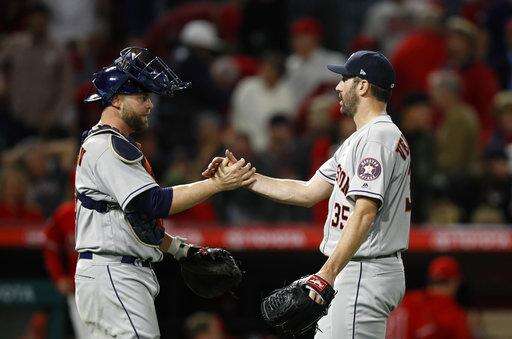 Houston Astros catcher Brian McCann, left, and starting pitcher Justin Verlander celebrate the team's 2-0 win over he Los Angeles Angels in a baseball game Wednesday, May 16, 2018, in Anaheim, Calif. Verlander threw a five-hitter. (AP Photo/Jae C. Hong) The Associated Press