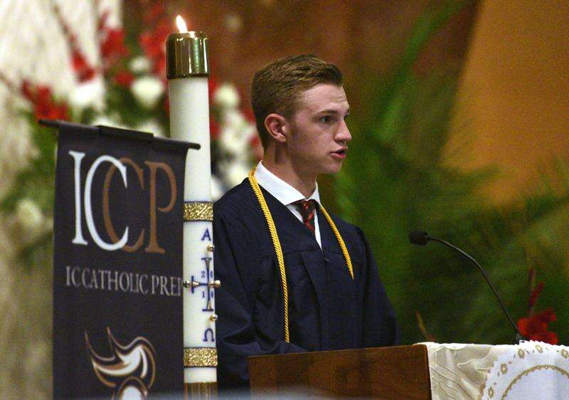 Senior class president Michael Hoffman addresses the crowd Saturday during the IC Catholic Prep graduation ceremony in Elmhurst.
