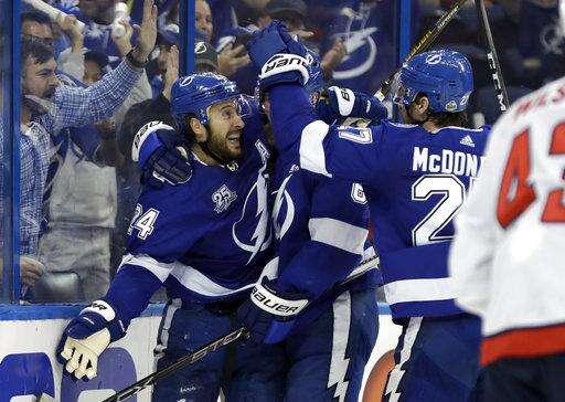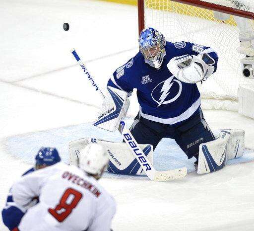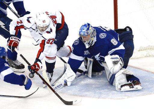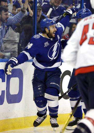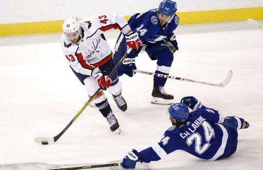 Notes: The road team won each of the first four games of a series for the sixth time in the last 10 years and 26th time in Stanley Cup playoffs history. Under that scenario, the road team has won Game 5 only three times. ... Paquette's goal was his first in the playoffs since Game 3 of the 2015 Stanley Cup Final, ending a 34-game drought for the 24-year-old center. ... At 19 seconds of the opening period, Palat's goal was not the fastest to start a game in Lightning history. Adam Hall scored for Tampa Bay 13 seconds into Game 2 of the Eastern Conference final against Boston in 2011. ... Capitals winger Andre Burakovsky was a game-time scratch.
