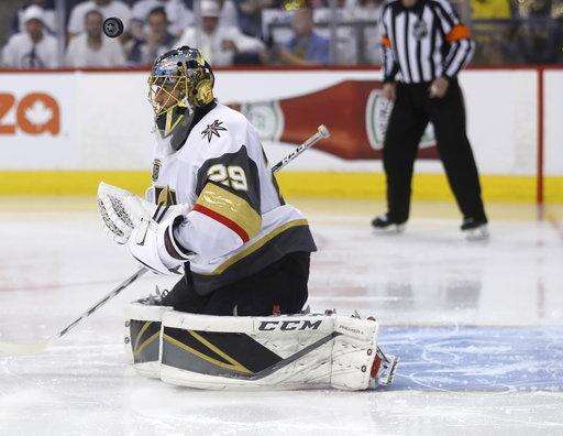Vegas Golden Knights goaltender Marc-Andre Fleury (29) deflects the puck wide of the net during first period NHL hockey action against the Winnipeg Jets' during Western Conference Finals, game 5, in Winnipeg, Sunday, May 20, 2018. (Trevor Hagan/The Canadian Press via AP) The Associated Press