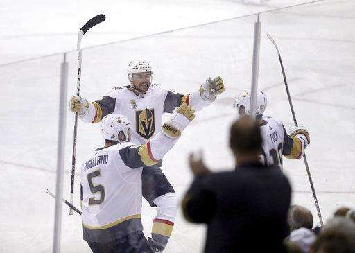 Vegas Golden Knights' Deryk Engelland (5), Ryan Carpenter (40) and Alex Tuch (89) celebrate after Tuck scored during first period NHL Western Conference Finals game 5 hockey action against the Winnipeg Jets, in Winnipeg, Sunday, May 20, 2018. (Trevor Hagan/The Canadian Press via AP) The Associated Press