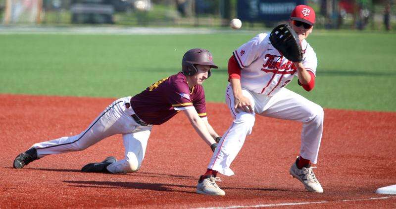 Timothy Christian first baseman Nick Huisman fields a pickoff throw as Northridge Prep's Stephen Brochu scrambles back safely during Class 2A regional boys baseball action at Plunkett Park in Elmhurst Wednesday.