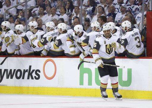 The Vegas Golden Knights celebrate after Ryan Reaves (75) scored during second period NHL Western Conference Finals game 5 hockey action against the Winnipeg Jets, in Winnipeg, Sunday, May 20, 2018. (Trevor Hagan/The Canadian Press via AP) The Associated Press