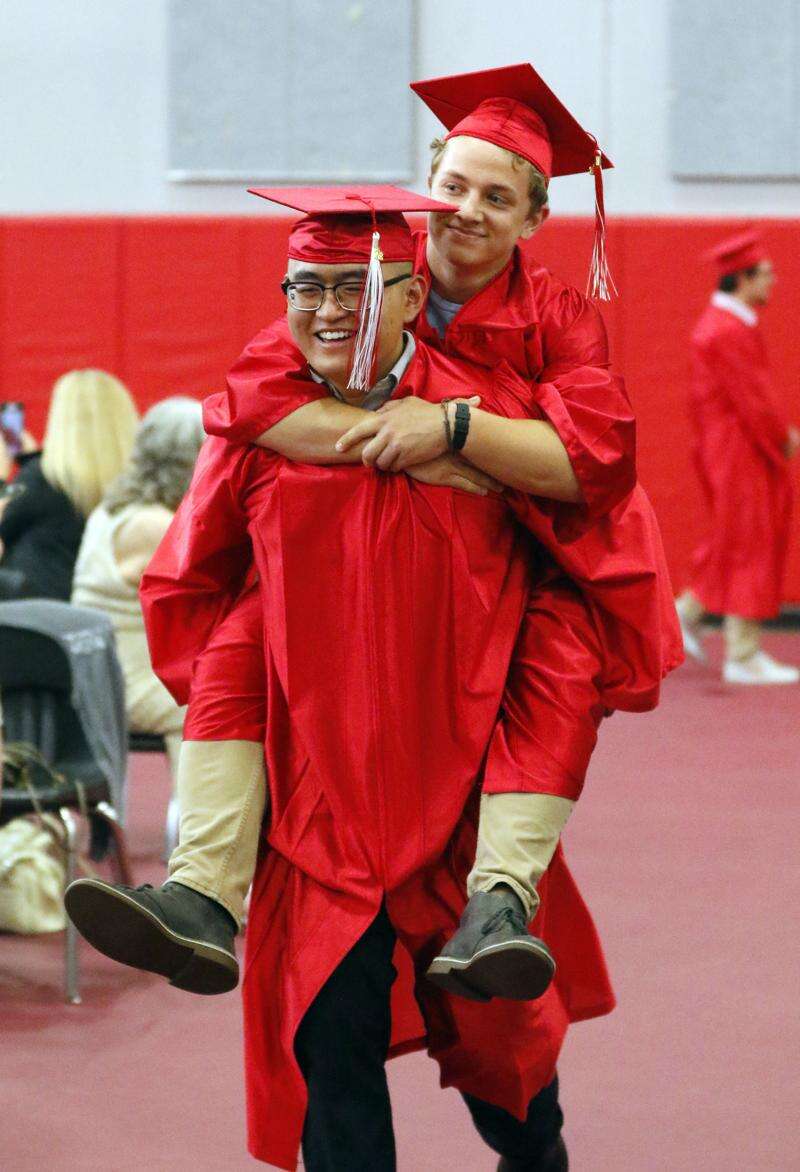 Paul DiCicco, gets a ride into the ceremony from Booker DongSunday during Aurora Christian High School graduation.