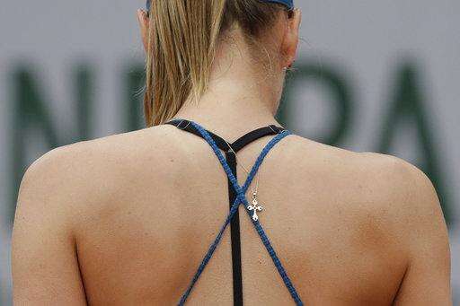 Russia's Maria Sharapova's necklace shows during her first round match of the French Open tennis tournament against Netherland's Richel Hogenkamp at the Roland Garros stadium in Paris, France, Tuesday, May 29, 2018. (AP Photo/Alessandra Tarantino) The Associated Press
