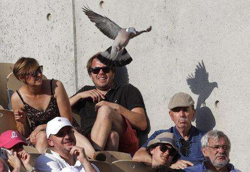 A pigeon flies over spectators as France's Nicolas Mahut plays Argentina's Juan Martin Del Potro during their first round match of the French Open tennis tournament at the Roland Garros stadium, Tuesday, May 29, 2018 in Paris. (AP Photo/Alessandra Tarantino) The Associated Press
