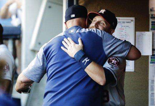 Houston Astros' Tim Federowicz, right, hugs a teammate before the team's baseball game against the New York Yankees on Tuesday, May 29, 2018, in New York. (AP Photo/Frank Franklin II) The Associated Press