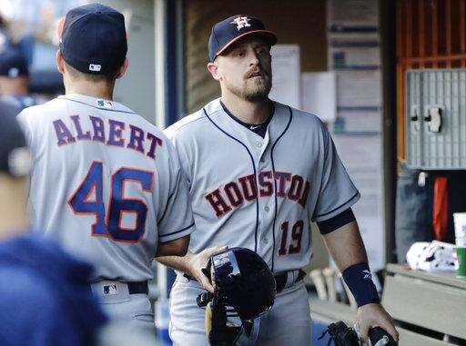 Houston Astros' Tim Federowicz (19) walks in the dugout during the first inning of the team's baseball game against the New York Yankees on Tuesday, May 29, 2018, in New York. (AP Photo/Frank Franklin II) The Associated Press