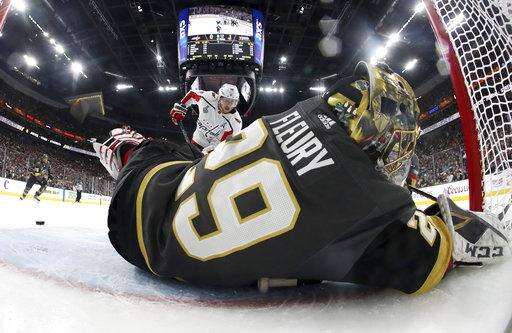 Vegas Golden Knights goaltender Marc-Andre Fleury, right, deflects a shot by Washington Capitals left wing Jakub Vrana, of the Czech Republic, during the second period in Game 2 of the NHL hockey Stanley Cup Finals on Wednesday, May 30, 2018, in Las Vegas. (AP Photo/Ross D. Franklin) The Associated Press