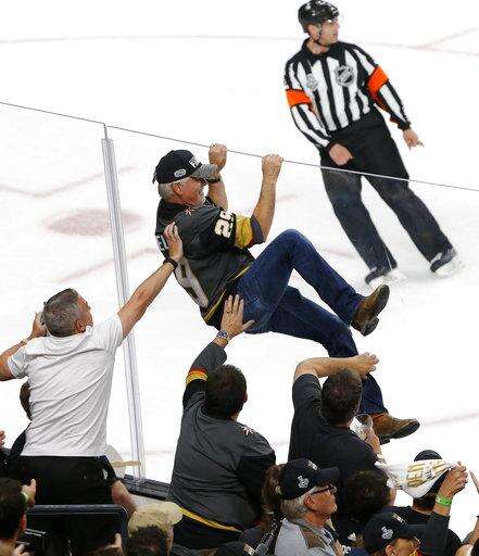 A fan tries to climb over the glass during the first period in Game 2 of the NHL hockey Stanley Cup Finals between the Vegas Golden Knights and the Washington Capitals on Wednesday, May 30, 2018, in Las Vegas. (AP Photo/Ross D. Franklin) The Associated Press