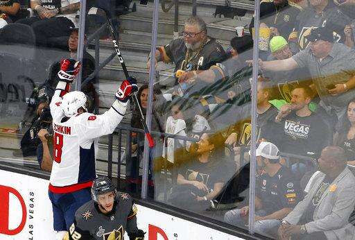 Washington Capitals left wing Alex Ovechkin, of Russia, celebrates his goal in front of fans during the second period in Game 2 of the NHL hockey Stanley Cup Finals against the Vegas Golden Knights Wednesday, May 30, 2018, in Las Vegas. (AP Photo/Ross D. Franklin) The Associated Press