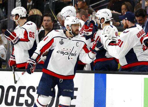 Washington Capitals left wing Alex Ovechkin, of Russia, celebrates his goal with teammates at the bench during the second period in Game 2 of the team's NHL hockey Stanley Cup Finals against the Vegas Golden Knights on Wednesday, May 30, 2018, in Las Vegas. (AP Photo/John Locher) The Associated Press