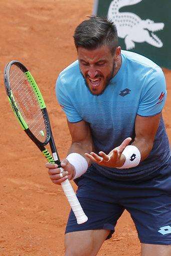 Bosnia and Herzegovina's Damir Dzumhur reacts during his third round match of the French Open tennis tournament against Germany's Alexander Zverev at the Roland Garros stadium in Paris, France, Friday, June 1, 2018. (AP Photo/Michel Euler) The Associated Press