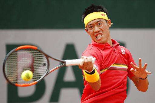 Japan's Kei Nishikori returns the ball to France's Gilles Simon during their third round match of the French Open tennis tournament at the Roland Garros stadium, Friday, June 1, 2018 in Paris. (AP Photo/Christophe Ena) The Associated Press