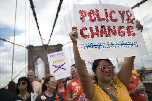 Demonstrators carry signs as they march over the Brooklyn bridge during a rally against gun violence, Saturday, June 2, 2018, in New York. Youth Over Guns, a gun violence prevention organization in New York City, lead a march across the Brooklyn Bridge to call for youth empowerment and investment in urban communities to end gun violence. (AP Photo/Mary Altaffer)
