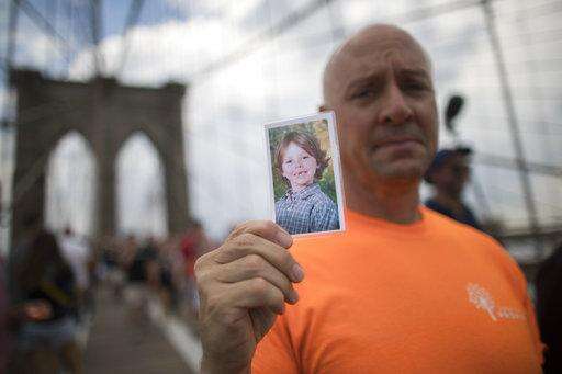 A demonstrator carries a prayer card for Daniel Gerard Barden, a victim of the Sandy Hook elementary school shooting, as he walks over the Brooklyn bridge during a march and rally against gun violence, Saturday, June 2, 2018, in New York. Youth Over Guns, a gun violence prevention organization in New York City, lead a march across the Brooklyn Bridge to call for youth empowerment and investment in urban communities to end gun violence. (AP Photo/Mary Altaffer)