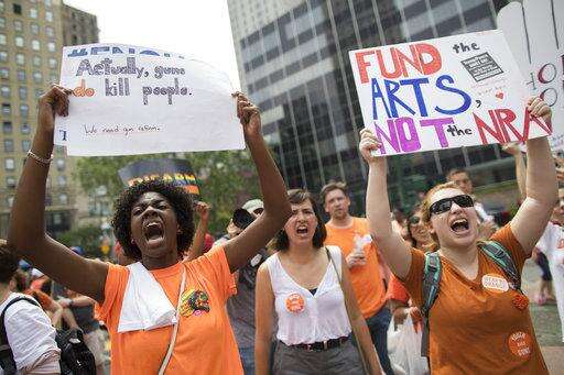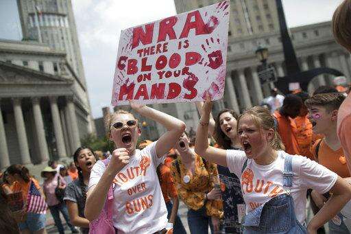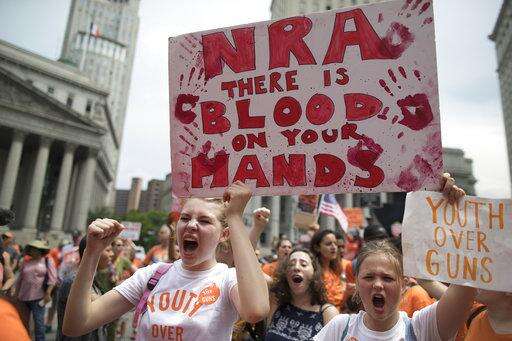 Demonstrators chant slogans during a march and rally against gun violence, Saturday, June 2, 2018, in New York. Youth Over Guns, a gun violence prevention organization in New York City, lead a march across the Brooklyn Bridge to call for youth empowerment and investment in urban communities to end gun violence. (AP Photo/Mary Altaffer)