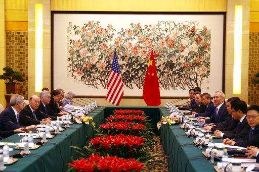 U.S. Commerce Secretary Wilbur Ross, second from left, and Chinese Vice Premier Liu He, fourth right, attend a meeting at the Diaoyutai State Guesthouse in Beijing, Sunday, June 3, 2018. U.S. Commerce Secretary Ross is in Beijing for talks on China's promise to buy more American goods after Washington ratcheted up tensions with a new threat of tariff hikes on Chinese high-tech exports. (AP Photo/Andy Wong, Pool) The Associated Press