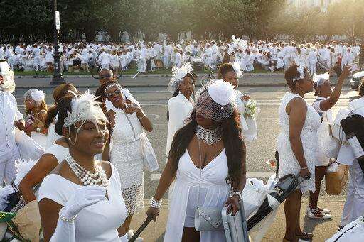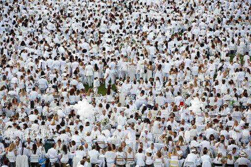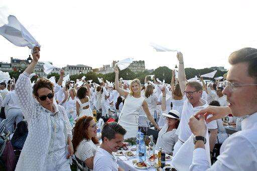 Participants dressed in white take part in the White Dinner, at the Invalides gardens, in Paris, Sunday, June 3, 2018. Parisians are preparing gourmet picnic hampers and all-white outfits for a meal at a location that only will be revealed at the last minute. The 30th anniversary of the international dining event known as "Diner en Blanc," or "Dinner in White," is being held in the French capital on Sunday night. (AP Photo/Thibault Camus) The Associated Press