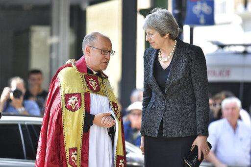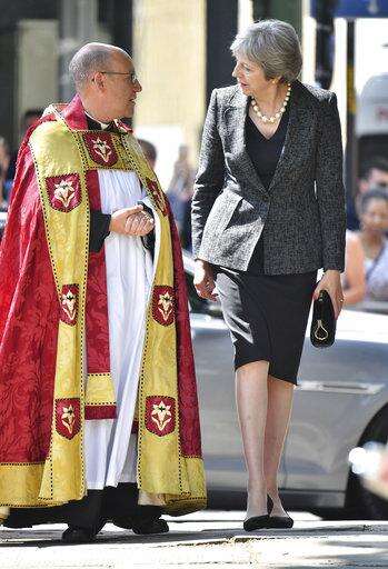 Britain's Prime Minister Theresa May speaks to Dean of Southwark Andrew Nunn as she arrives for a service of commemoration at Southwark Cathedral, London, Sunday June 3, 2018, to mark one year since a deadly vehicle-and-knife attack on London Bridge. Britain's resolve to "stand firm" against terrorism is stronger than ever, Prime Minister Theresa May said on Sunday. (Dominic Lipinski/Pool via AP) The Associated Press