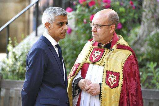 Mayor of London Sadiq Khan speaks to Dean of Southwark Andrew Nunn as he arrives for a service of commemoration at Southwark Cathedral, London, Sunday June 3, 2018, to mark one year since a deadly vehicle-and-knife attack on London Bridge. Britain's resolve to "stand firm" against terrorism is stronger than ever, Prime Minister Theresa May said on Sunday. (Dominic Lipinski/Pool via AP) The Associated Press
