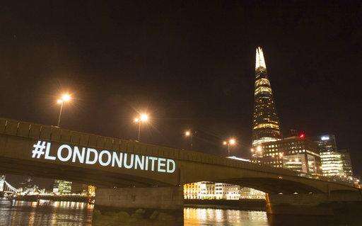 A tribute is projected onto the side of London Bridge, London, Sunday June 3, 2018, to mark one year since a deadly vehicle-and-knife attack on London Bridge. Prime Minister Theresa May says Britain's resolve to "stand firm" against terrorism is stronger than ever. (Dominic Lipinski/PA(/PA via AP) The Associated Press
