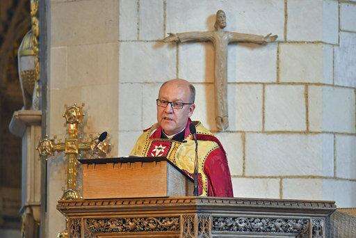 Dean of Southwark Andrew Nunn speaks during a service of commemoration at Southwark Cathedral, London, Sunday June 3, 2018, to mark one year since a deadly vehicle-and-knife attack on London Bridge. Britain's resolve to "stand firm" against terrorism is stronger than ever, Prime Minister Theresa May said on Sunday. (Dominic Lipinski/Pool via AP) The Associated Press