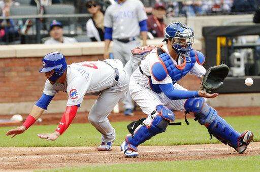 Chicago Cubs' Willson Contreras, left, runs past New York Mets catcher Kevin Plawecki, right, to score on a sacrifice fly ball by teammate Ben Zobrist during the seventh inning of a baseball game Sunday, June 3, 2018, in New York. (AP Photo/Frank Franklin II) The Associated Press