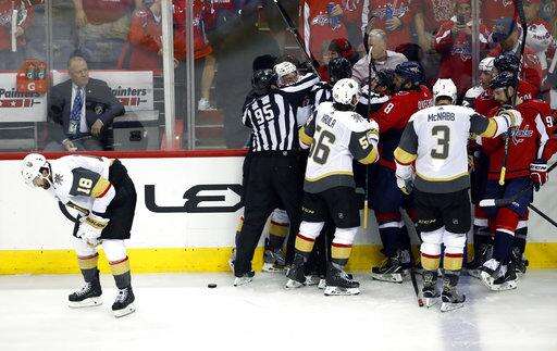 Vegas Golden Knights forward James Neal, left, skates away after being checked while teammates tangle with Washington Capitals players during the second period in Game 3 of the NHL hockey Stanley Cup Final, Saturday, June 2, 2018, in Washington. (AP Photo/Pablo Martinez Monsivais) The Associated Press