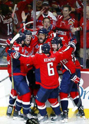 Washington Capitals forward Alex Ovechkin, center, of Russia, celebrates with teammates after scoring a goal against the Vegas Golden Knights during the second period in Game 3 of the NHL hockey Stanley Cup Final, Saturday, June 2, 2018, in Washington. (AP Photo/Pablo Martinez Monsivais) The Associated Press