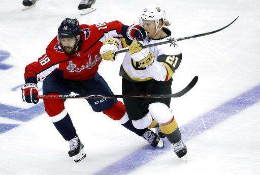 Washington Capitals forward Chandler Stephenson (18) contends with Vegas Golden Knights forward Cody Eakin (21) during the third period in Game 3 of the NHL hockey Stanley Cup Final, Saturday, June 2, 2018, in Washington. (AP Photo/Pablo Martinez Monsivais) The Associated Press